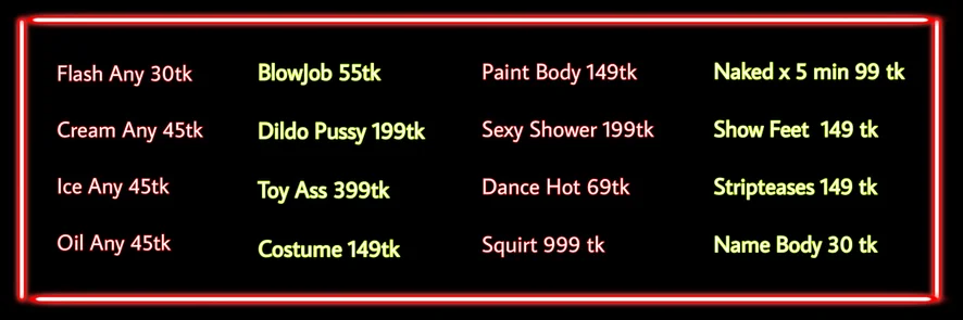 Spanking, Erotic Dance, Doggy Style, Fingering, Dirty Talk, Shower, Striptease, Sex Toys, Tittyfuck, Gagging, Oil Show, Topless, Twerk, Strapon, Dildo or Vibrator, Double Penetration, Facial, Anal Toys, Masturbation, Squirt, Anal, Fisting, Blowjob